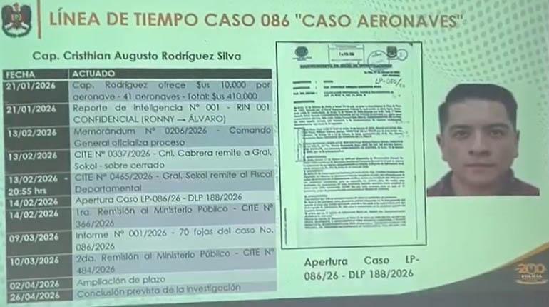 “Para conocimiento de todos ustedes, en este momento el Capitán Rodríguez ya ha sido aprehendido y se encuentra a disposición del Ministerio Público, en el departamento de Santa Cruz, seguramente a la espera de su audiencia de medidas cautelares”, señaló la autoridad policial.